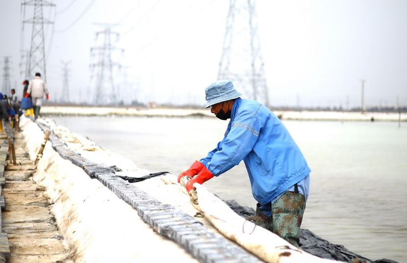 ? ? ? ??首先來到海州灣公司大浦班組。這里是公司礦鹵復(fù)產(chǎn)工作重點(diǎn)班組,職工們正在整理結(jié)晶池、搶修塑苫布。據(jù)海州灣公司負(fù)責(zé)人劉天義現(xiàn)場介紹,由于前期審批、采購等原因,加之突發(fā)的新冠肺炎疫情,結(jié)晶池塑苫布沒能及時(shí)更新,預(yù)報(bào)25日有明顯降雨過程,海州灣廣大職工因地制宜,收舊利廢,積極備戰(zhàn)大雨天時(shí)。